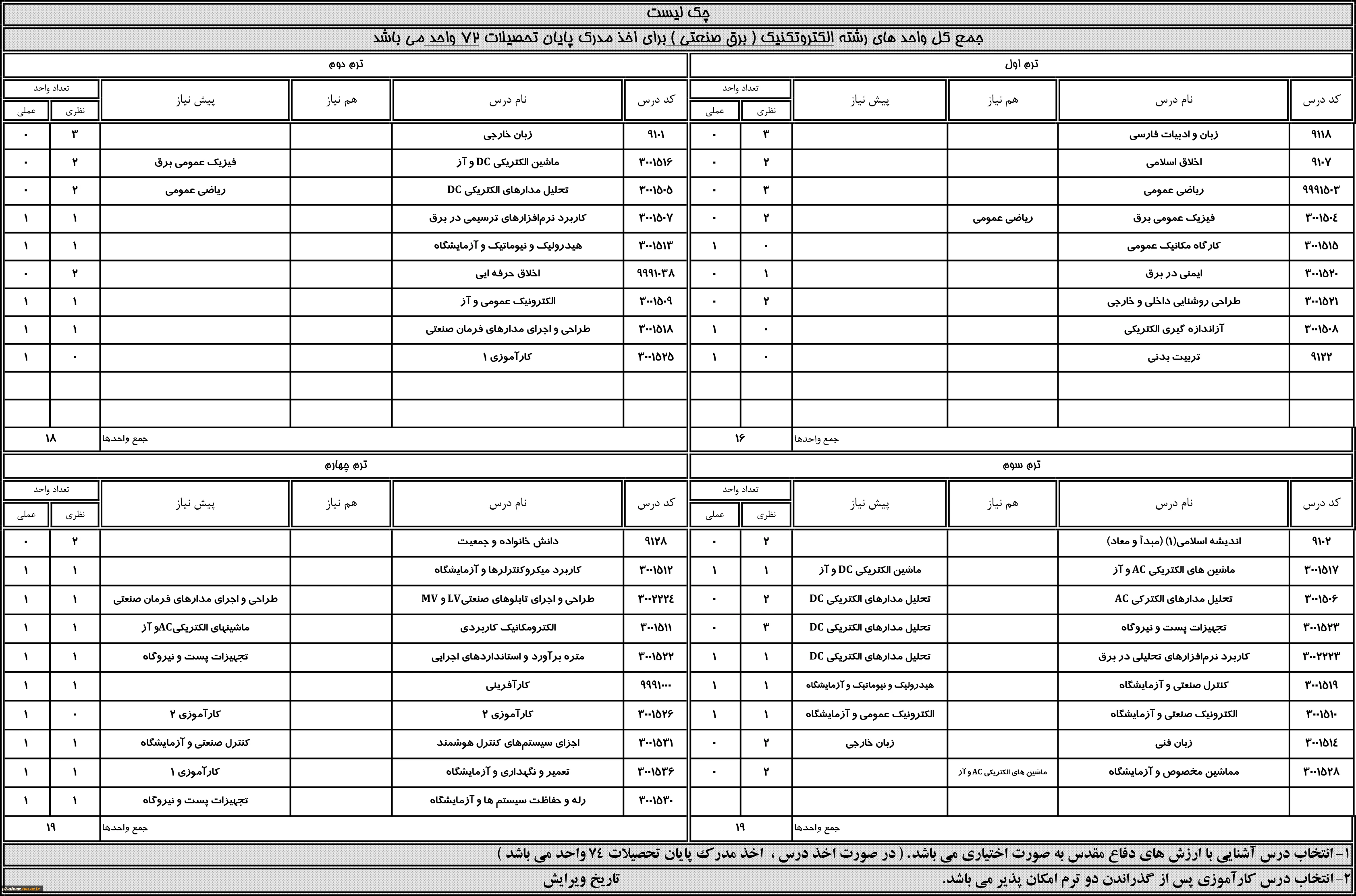 چک لیست دروس رشته ها
